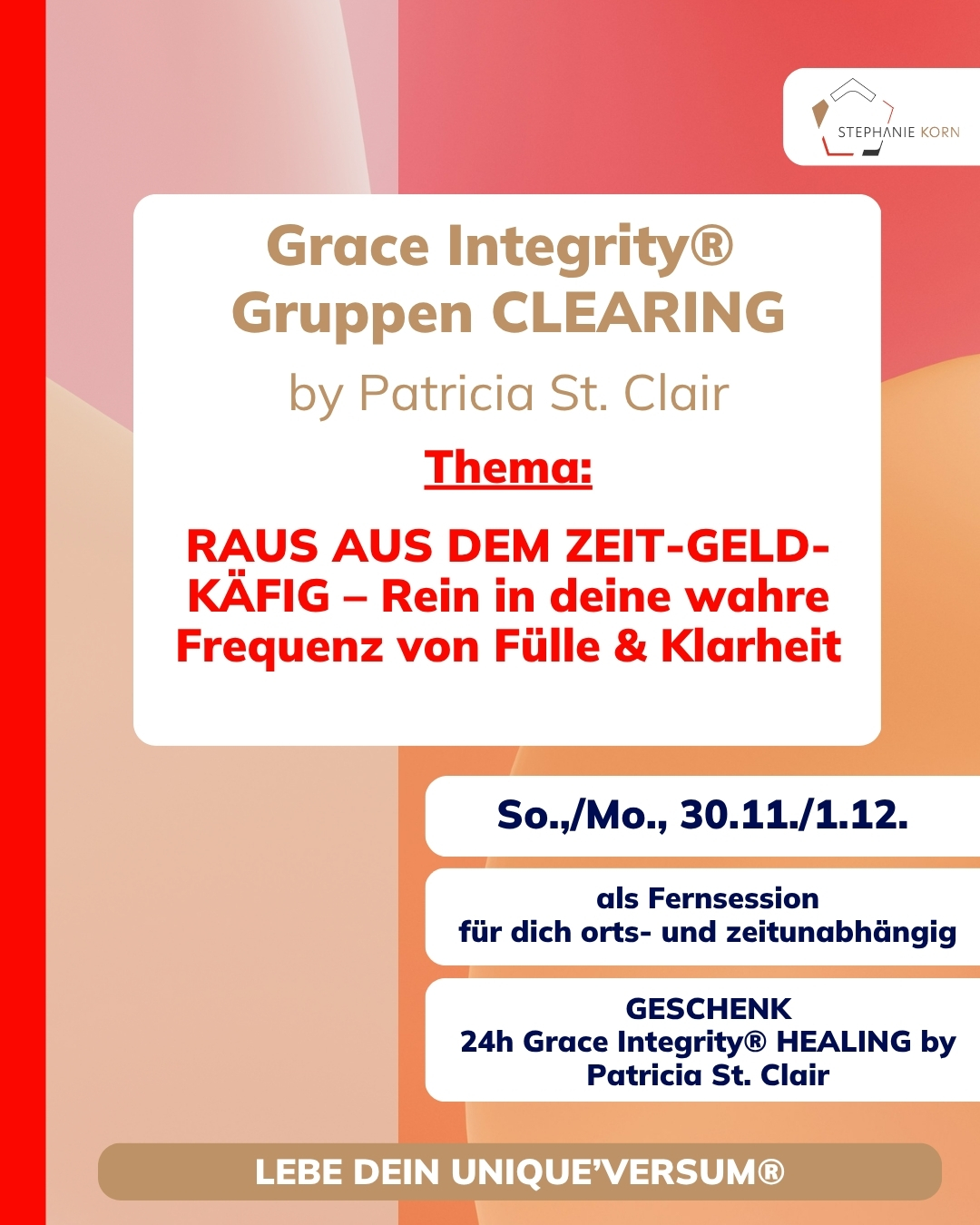 🎁 Das 48h Grace Integrity® Clearing “Raus aus dem Zeit-Geld-Käfig” am 30.11./1.12. – inkl. 24h Healing-Geschenk.
