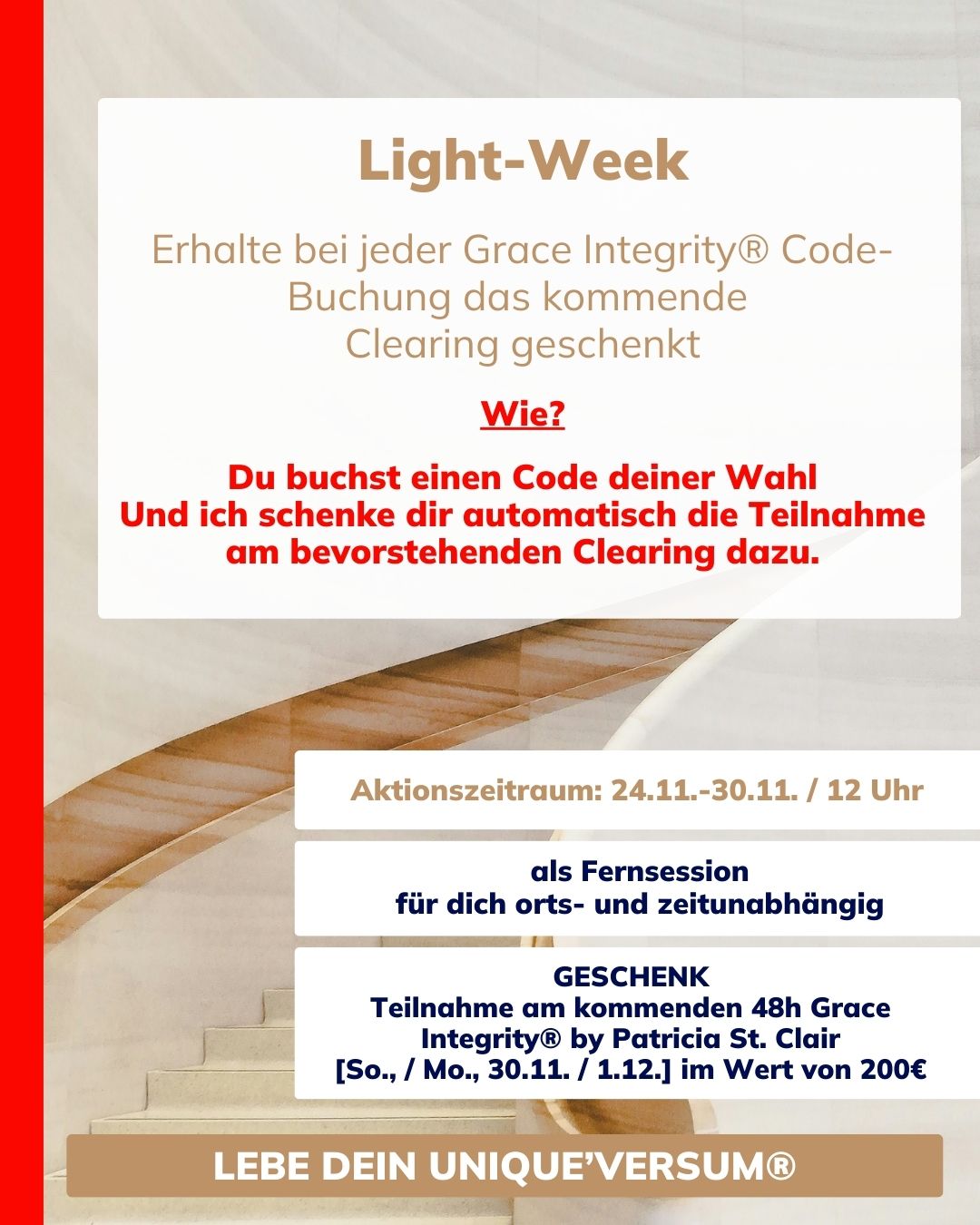 📌 Jede Code-Übertragung, die du zwischen heute und Sonntag, 30.11., 12:00 Uhr buchst, enthält automatisch das 48h Grace Integrity® Clearing am 30.11./1.12. zum Thema „Geld-Zeit-Käfig“ als Geschenk.